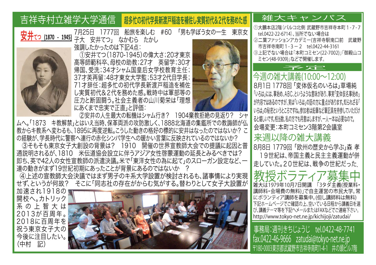 | 7月25日 1777回 | 7月25日(土) 船旅を楽しむ #60 「男も学ぼう 女の一生 東京女子大 安井てつ」なかむら たかし/日程変更 |