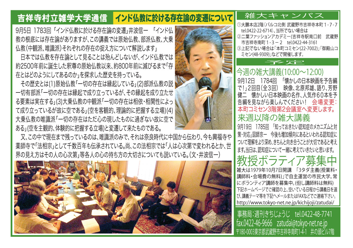 | 9月5日 1783回 | 9月5日「インド仏教に於ける存在論の変遷」井波信一 「インド仏教の根底には存在論がありますが、この講義では原始仏教、部派仏教、大乗仏教(中観派、唯識派)それぞれの存在の捉え方について解説します」 | |