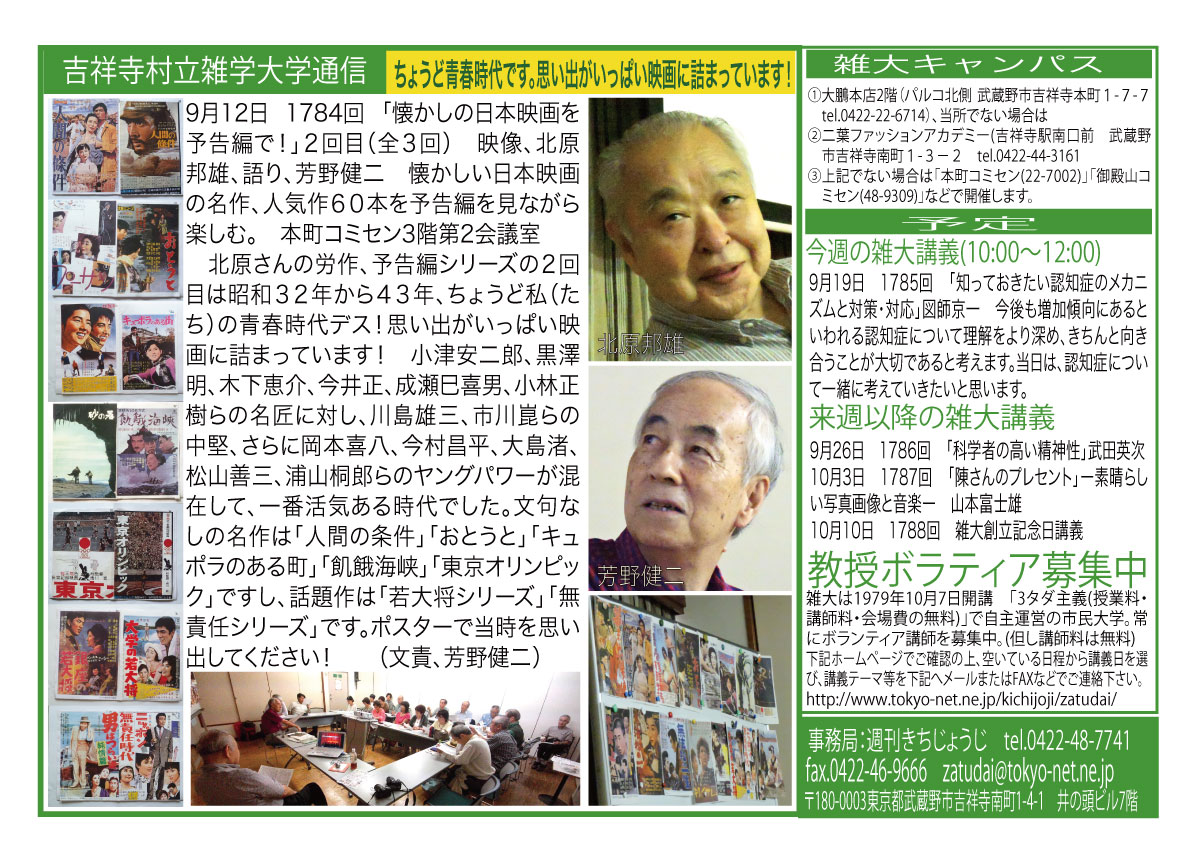 | 9月12日 1784回 | 9月12日「懐かしの日本映画を予告編で!」(全3回)2回目 映像、北原邦雄、語り、芳野健二 懐かしい日本映画の名作、人気作60本を予告編を見ながら楽しんでください! 会場変更:本町コミセン3階第2会議室へ変更します。 |
