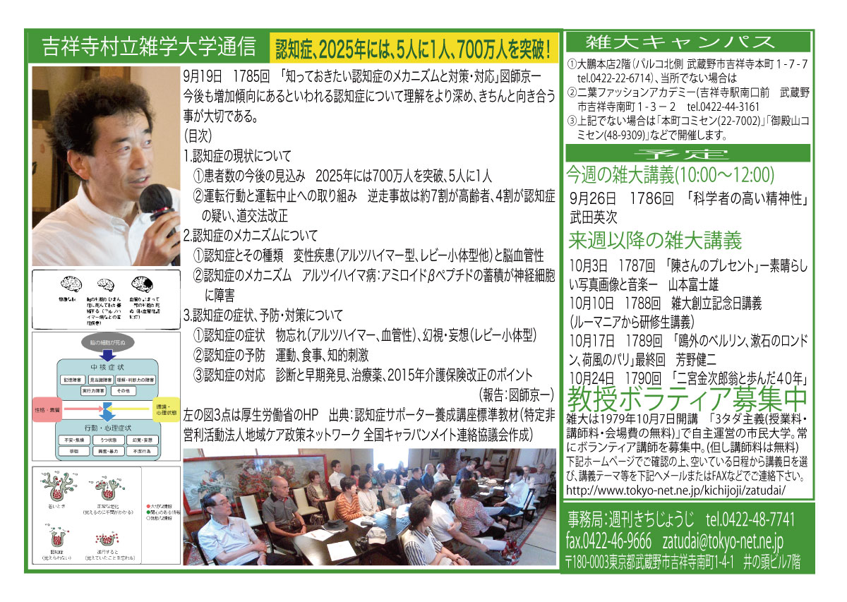 | 9月19日 1785回 | 9月19日(土)「知っておきたい認知症のメカニズムと対策・対応」図師京一 今後も増加傾向にあるといわれる認知症について理解をより深め、きちんと向き合うことが大切であると考えます。当日は、認知症について一緒に考えていきたいと思います。 | |