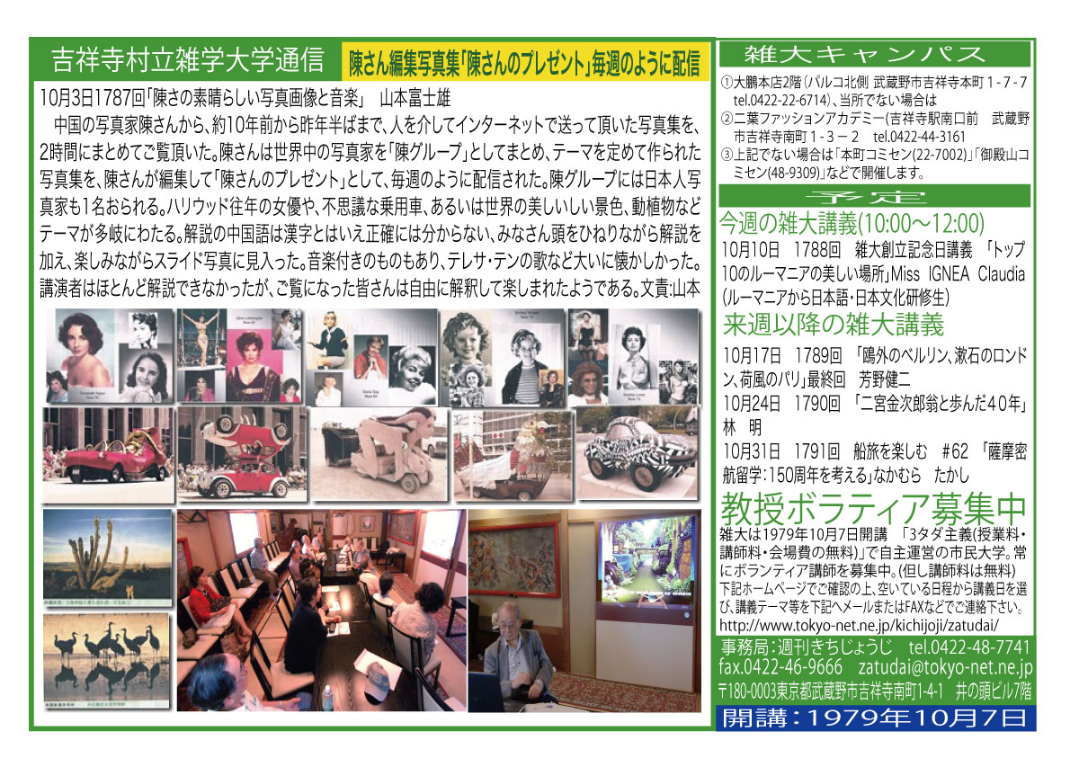 10月3日(土)「陳さんのプレセント」ー素晴らしい写真画像と音楽ー 山本富士雄 株式会社山本富士雄設計事務所 |