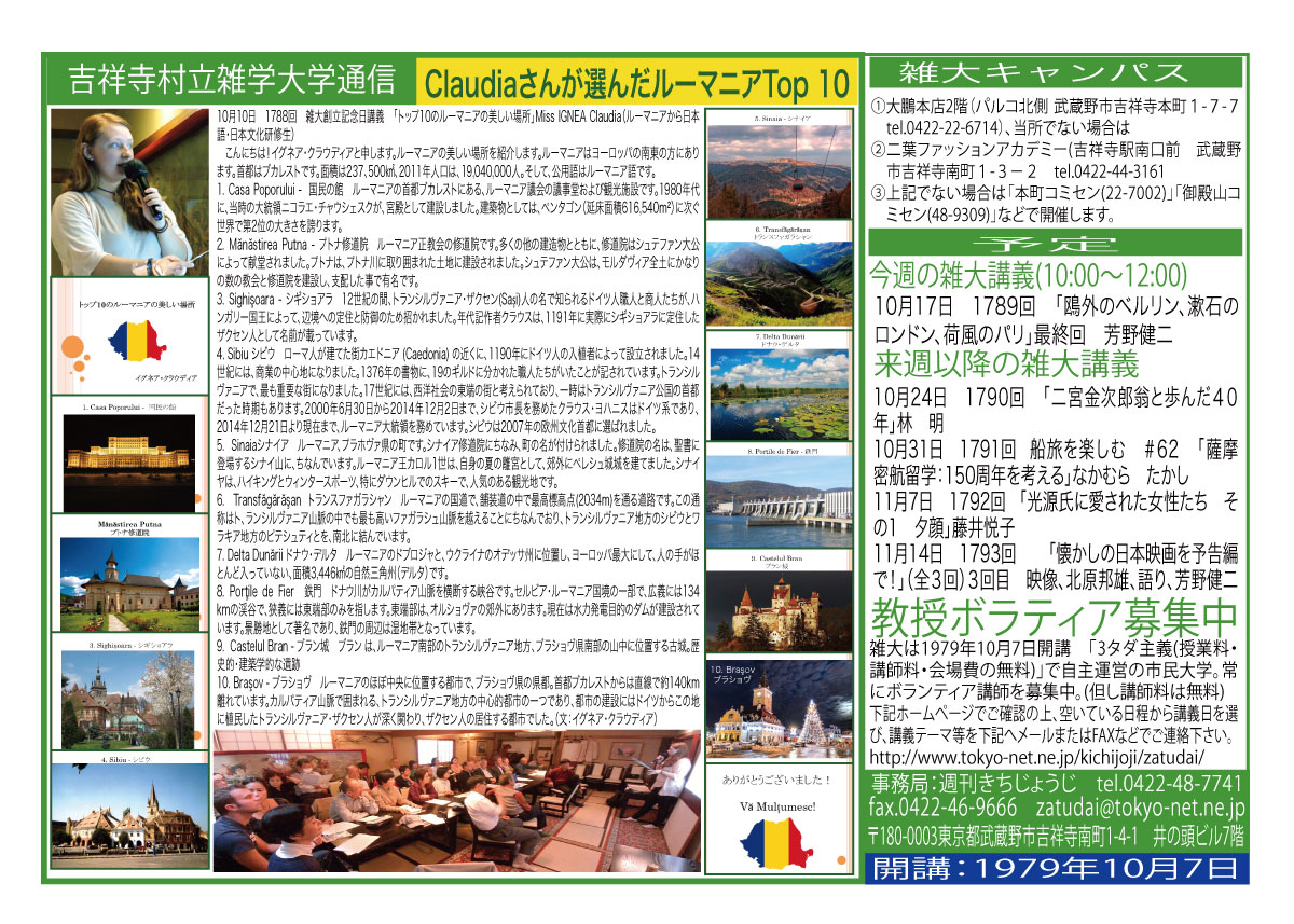 | 10月10日 1788回 | 雑大創立記念日講義 「トップ10のルーマニアの美しい場所」Miss IGNEA Claudia(ルーマニアから日本語・日本文化研修生) | |