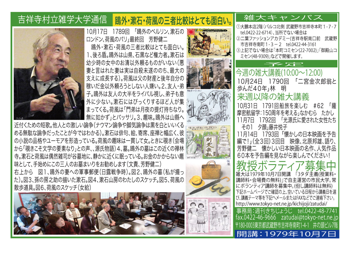 | 10月17日 1789回 | 10月17日「鴎外のベルリン、漱石のロンドン、荷風のパリ」最終回 芳野健二 | |