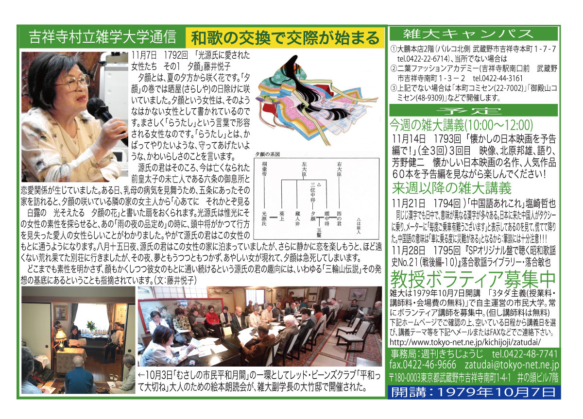 | 11月7日 1792回 | 11月7日「光源氏に愛された女性たち その1 夕顔」藤井悦子 | |