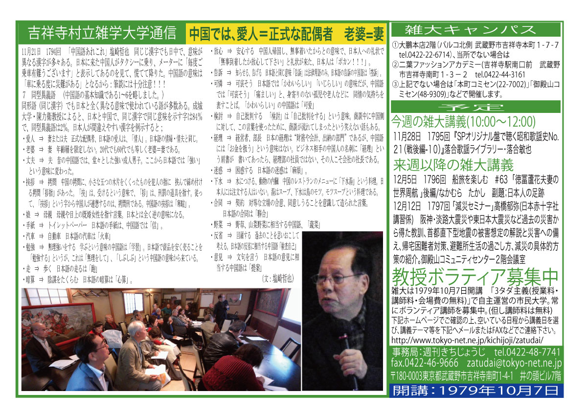 | 11月21日 1794回 | 11月21日(土)「中国語あれこれ」塩崎哲也 同じじ漢字でも日中で、意味が異なる漢字が多々ある。日本に来た中国人がタクシーに乗り、メーターに「毎度ご乗車有難うございます」と表示してあるのを見て、慌てて降りた。中国語の意味は「車に乗る度に災難がある」となるから:筆談には十分注意!!! | |