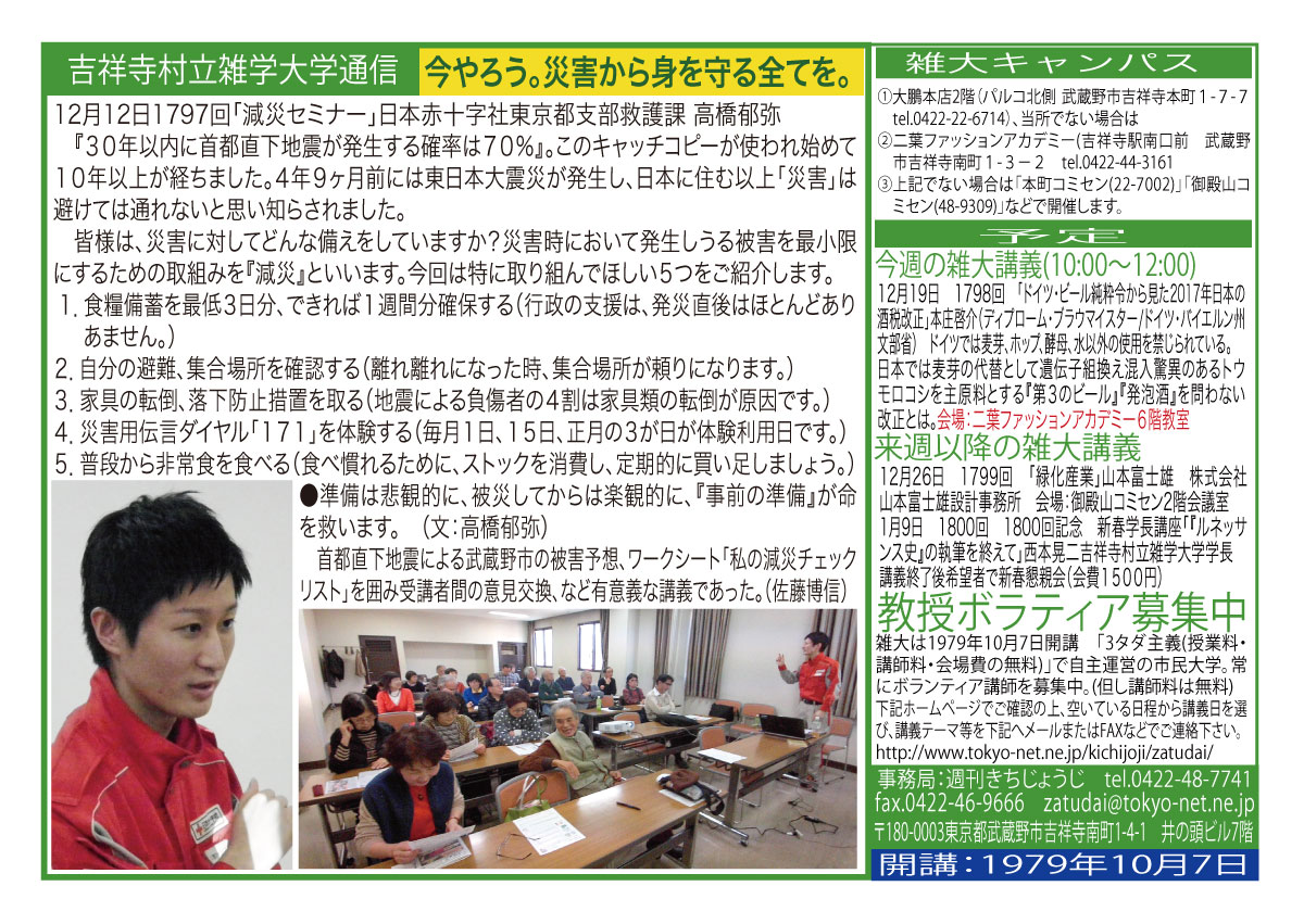 | 12月12日 1797回 | 12月12日(土)「減災セミナー」高橋郁弥(日本赤十字社講習係) 阪神・淡路大震災や東日本大震災など過去の災害から得た教訓、首都直下型地震の被害想定の解説と災害への備え、帰宅困難者対策、避難所生活の過ごし方、減災の具体的方策の紹介。 会場:御殿山コミュニティセンター2階会議室(紹介者:佐藤博信) |