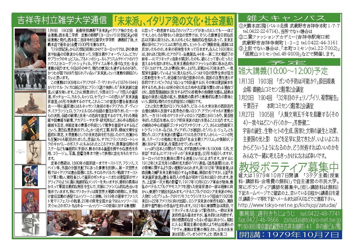 新春特別講義「イタリア『未来派』、変動の時期『(ヨーロッパ19)世紀末』の芸術運動と現代」西本晃二吉祥寺村立雑学大学学長 講義終了後、大鵬本店で新年会(会費1500円)を兼ねます。