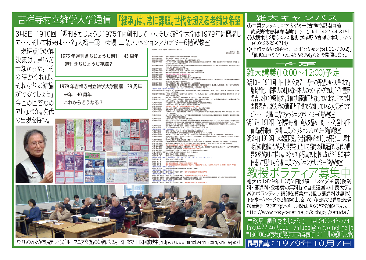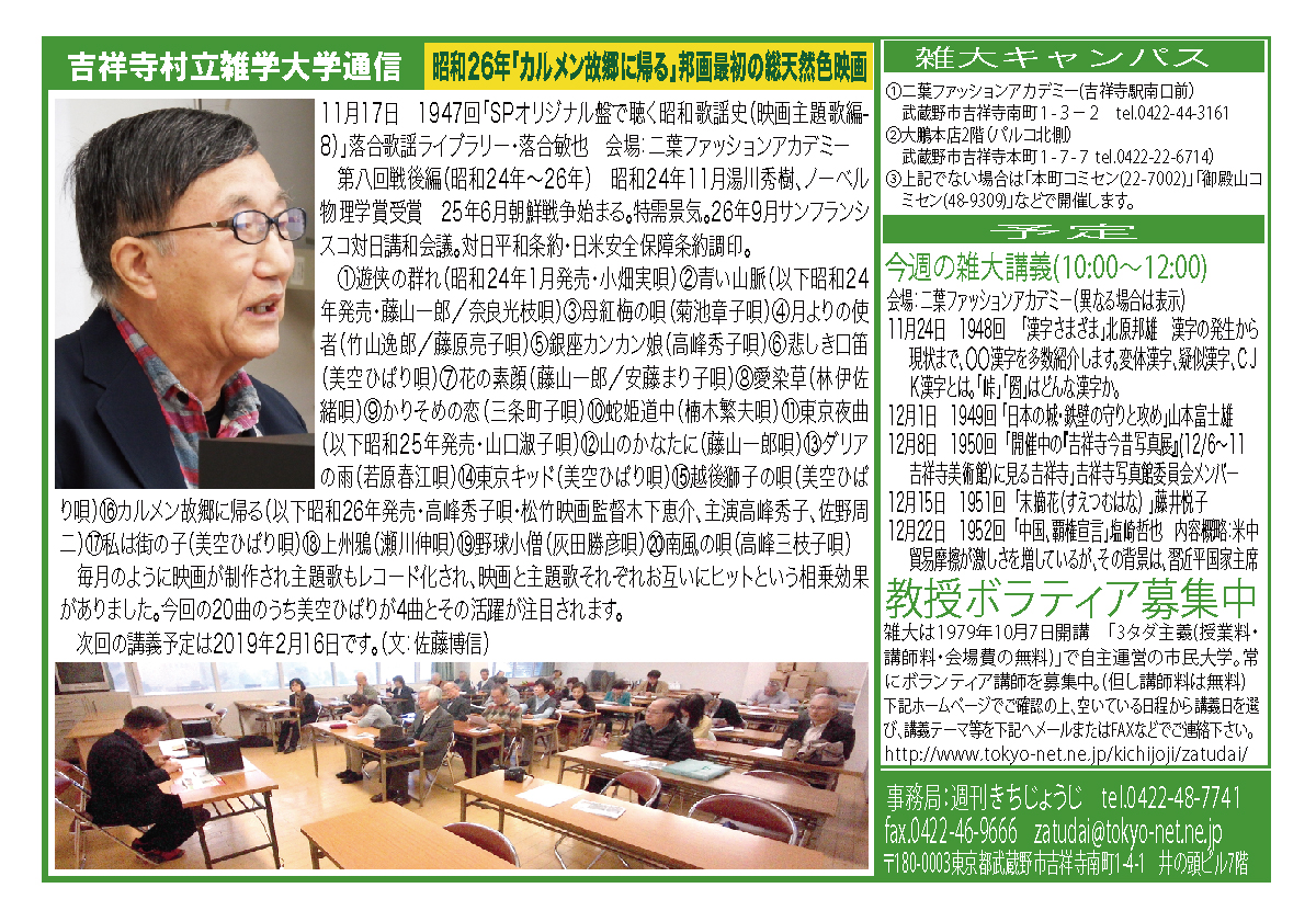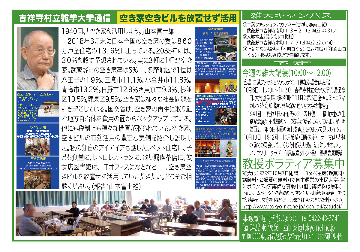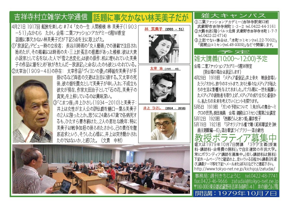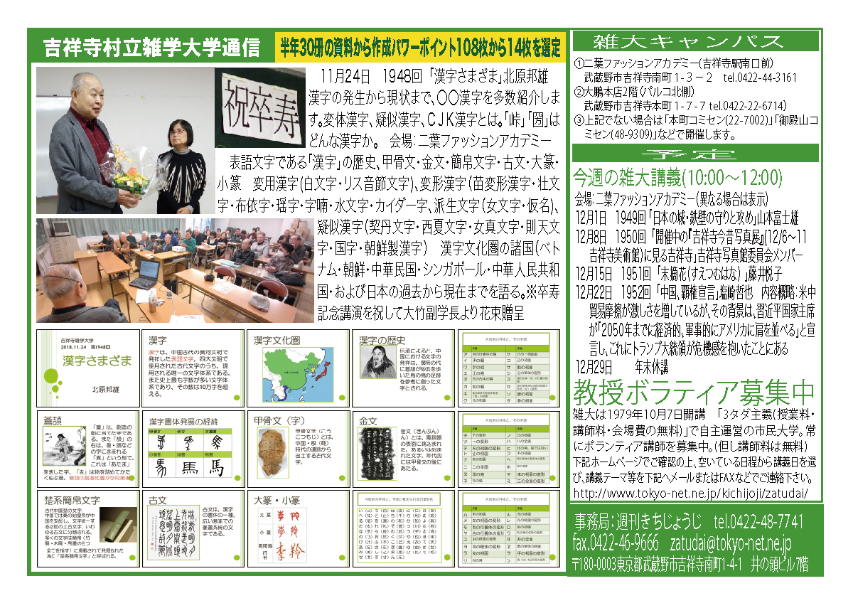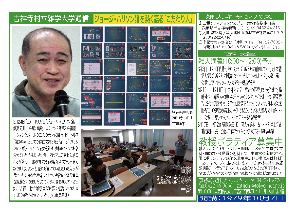 「週刊きちじょうじ1975年に創刊して・・・、そして雑学大学は1979年に開講して・・・、そして将来は・・・?」大橋一範 会場:二葉ファッションアカデミー6階W教室 |