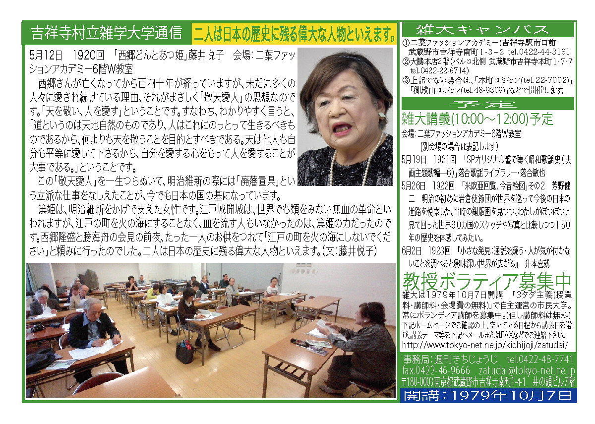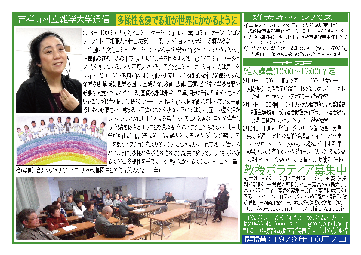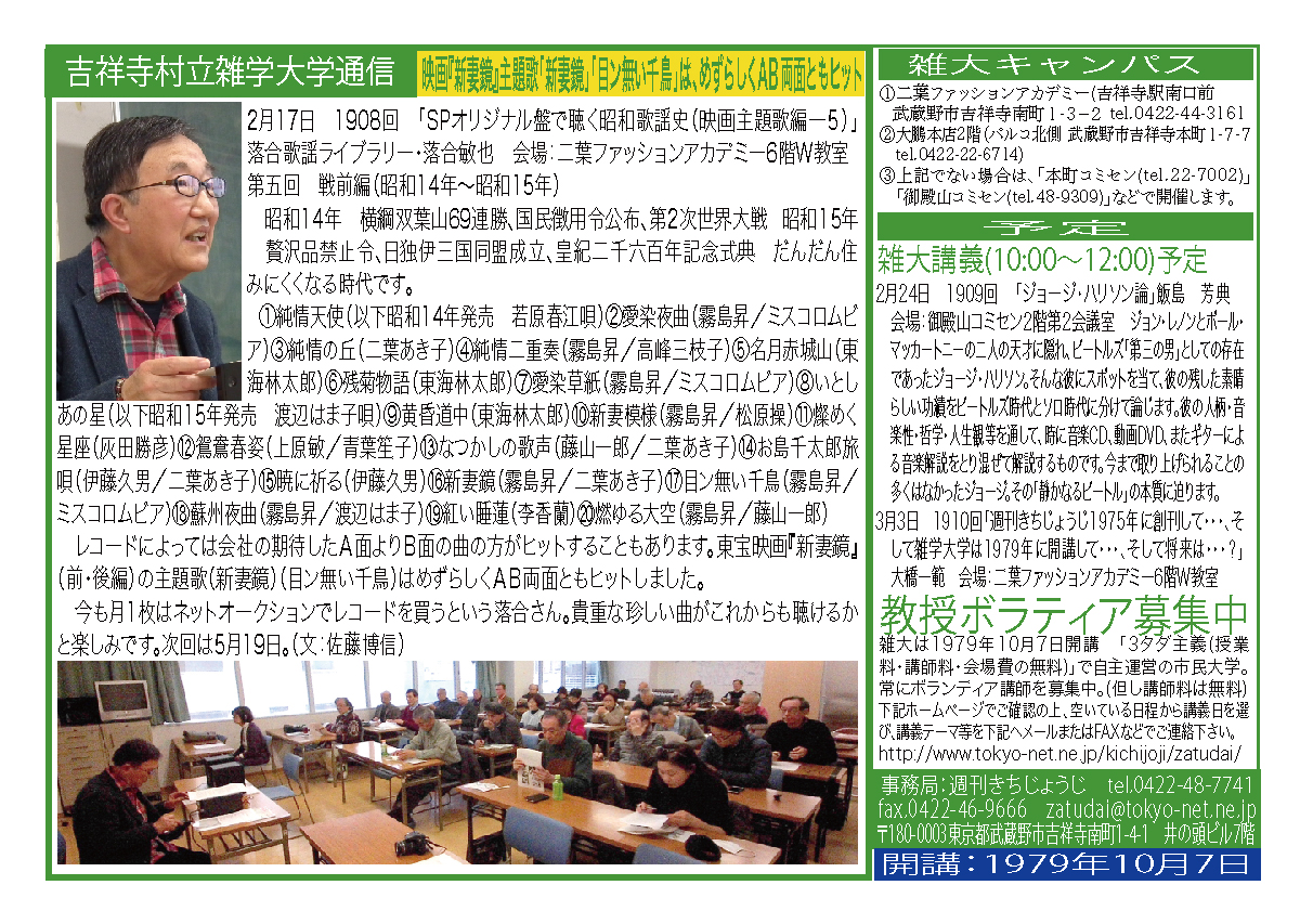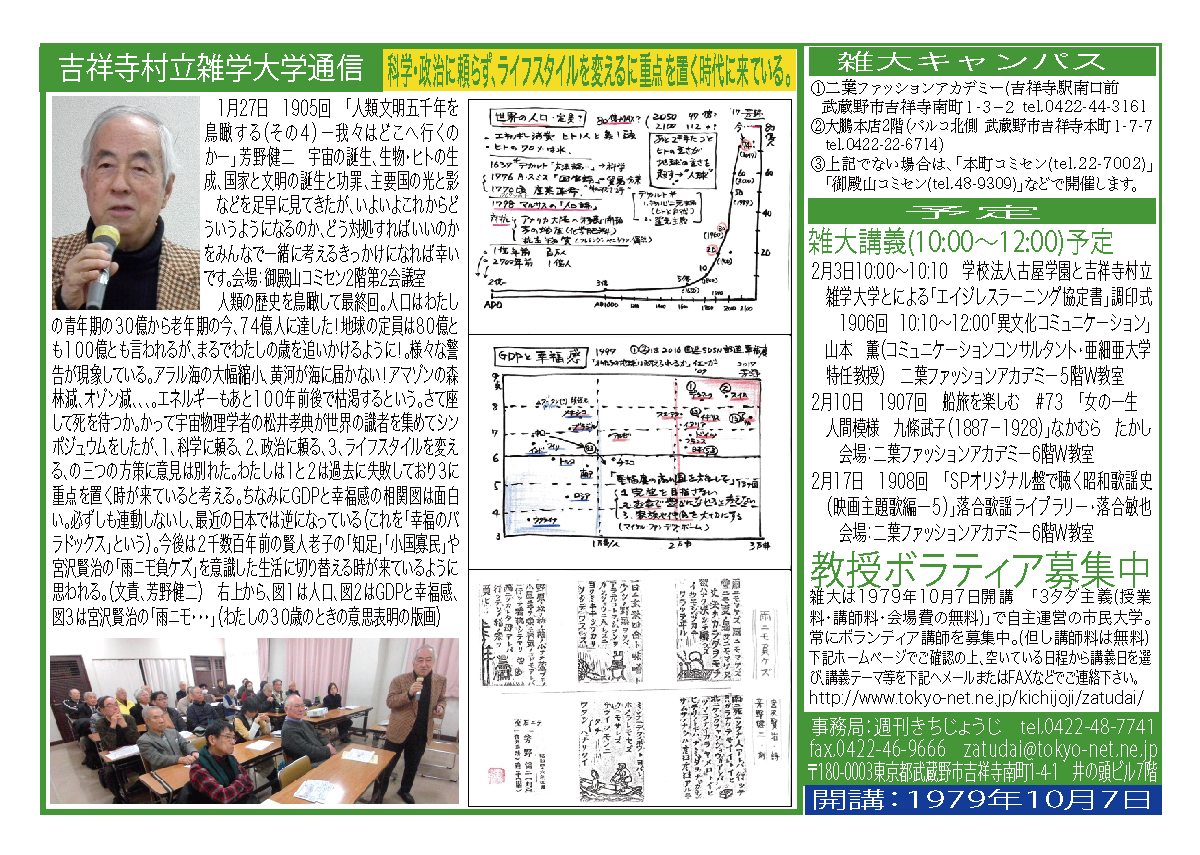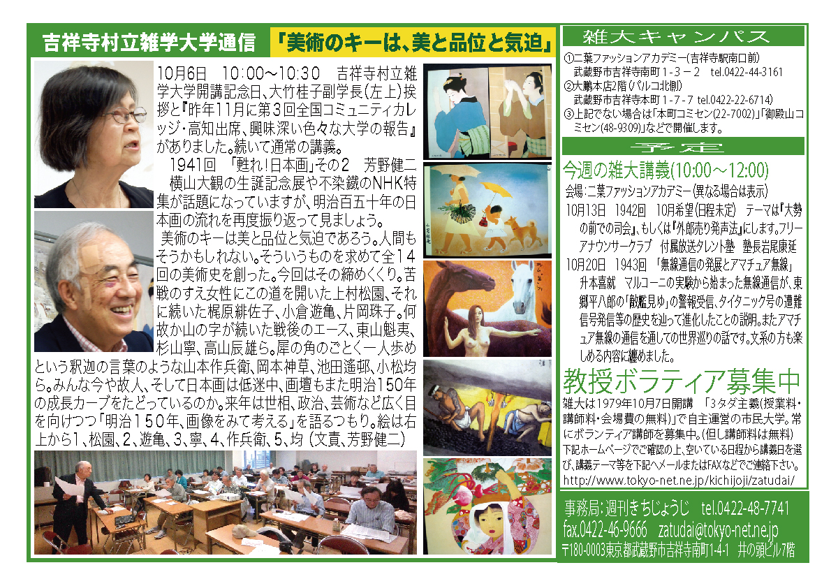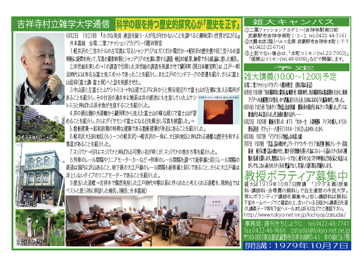 「週刊きちじょうじ1975年に創刊して・・・、そして雑学大学は1979年に開講して・・・、そして将来は・・・?」大橋一範 会場:二葉ファッションアカデミー6階W教室 |