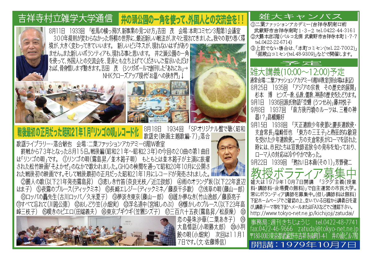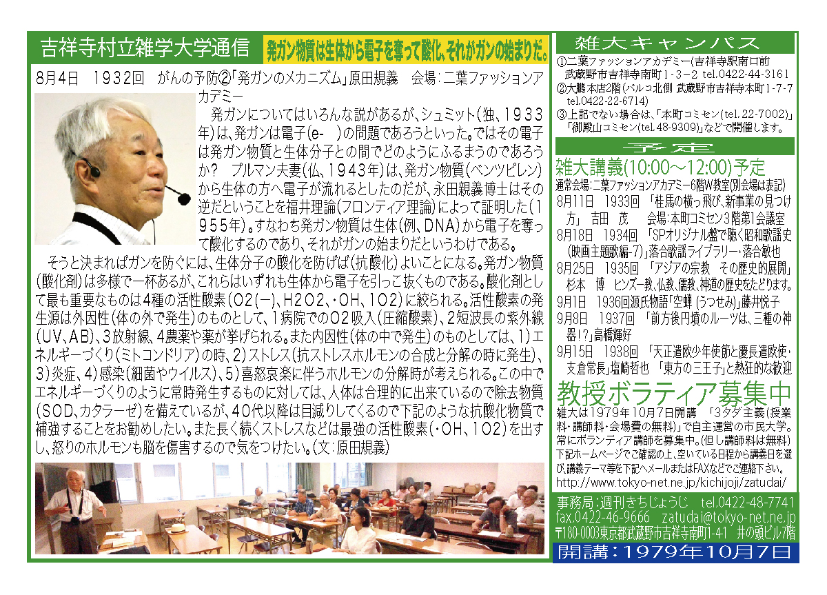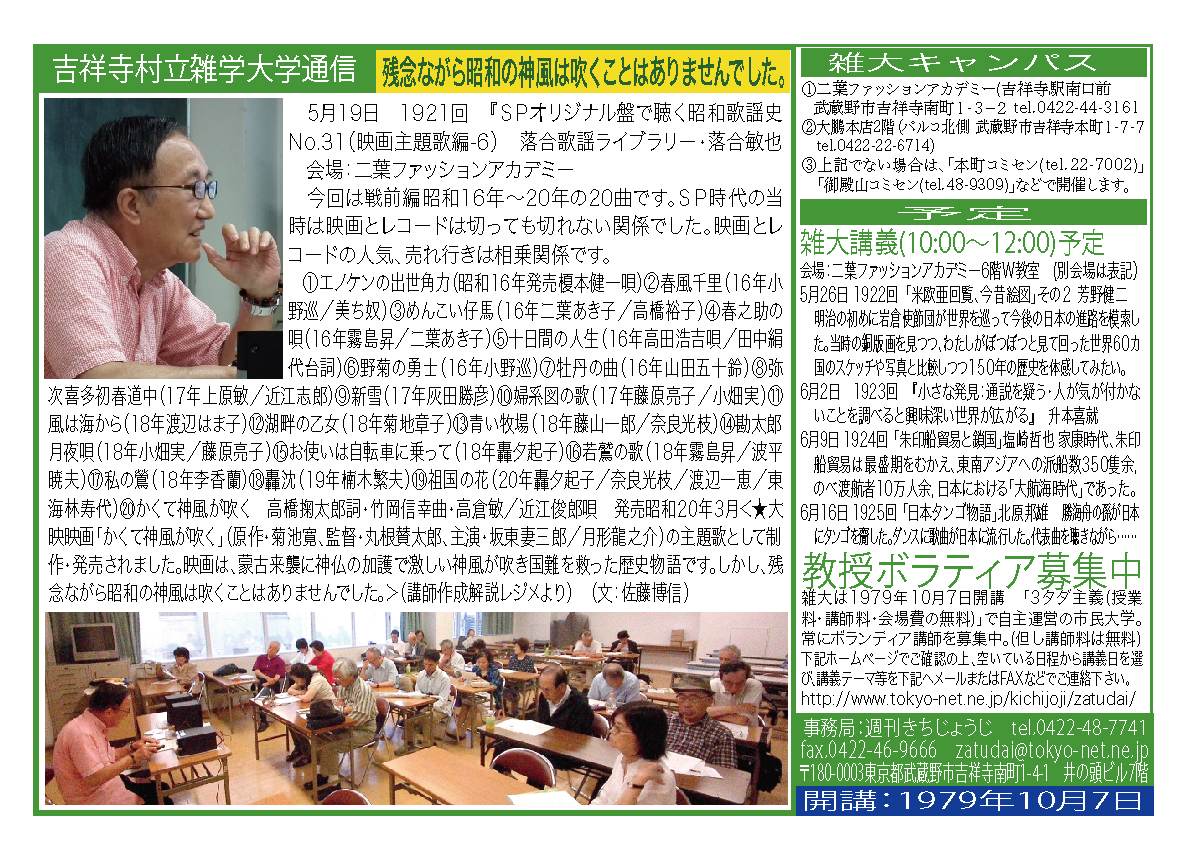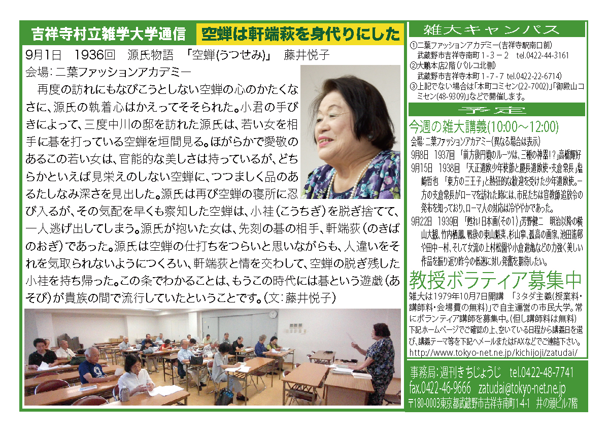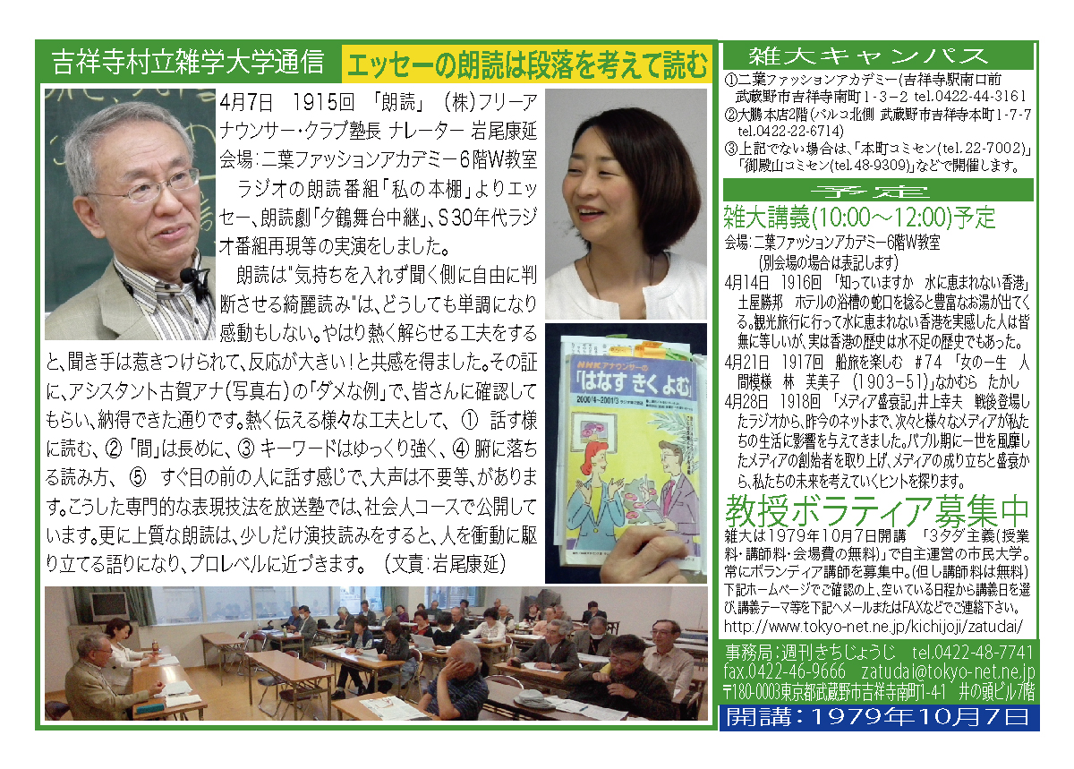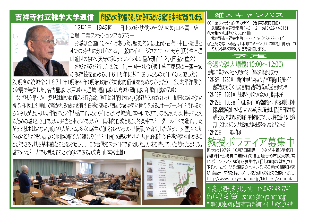 「週刊きちじょうじ1975年に創刊して・・・、そして雑学大学は1979年に開講して・・・、そして将来は・・・?」大橋一範 会場:二葉ファッションアカデミー6階W教室 |