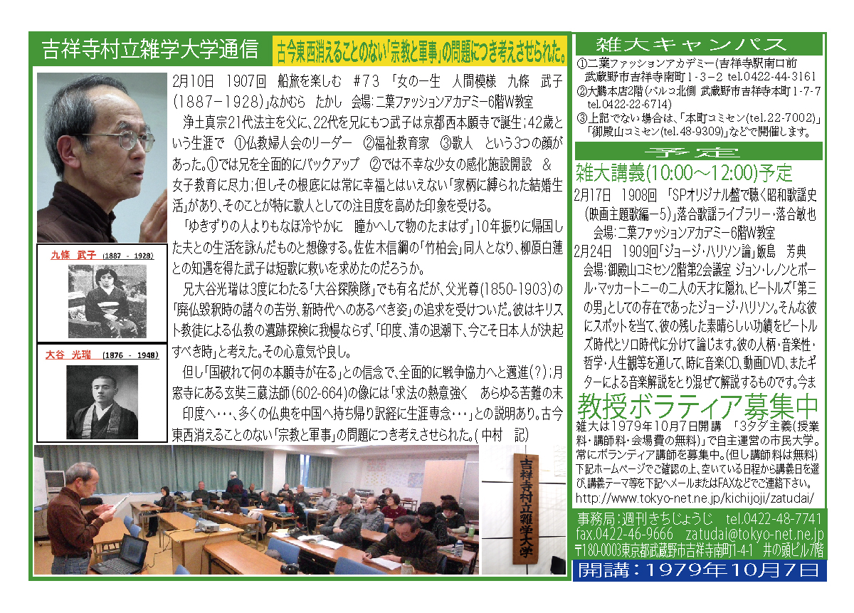| 2月10日 1907回 | 船旅を楽しむ #73 「女の一生 人間模様 九條 武子(1887〜1928)」なかむら たかし 会場:二葉ファッションアカデミー6階W教室 | |