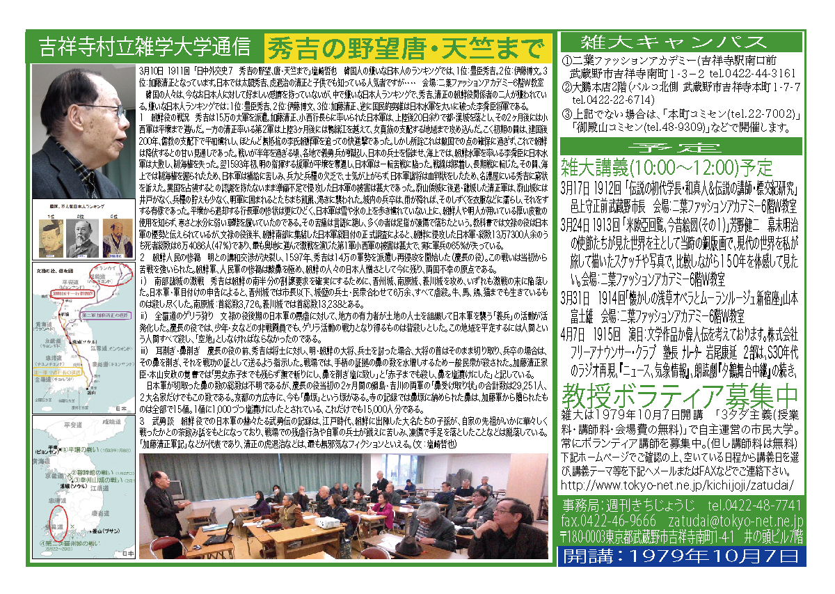 | 3月10日 1911回 | 「日中外交史7 秀吉の野望、唐・天竺まで」塩崎哲也 韓国人の嫌いな日本人のランキングでは、1位:豊臣秀吉。2位:伊藤博文。3位:加藤清正となっています。日本では太閤秀吉、虎退治の清正と子供でも知っている人気者ですが・・・・ 会場:二葉ファッションアカデミー6階W教室 | |