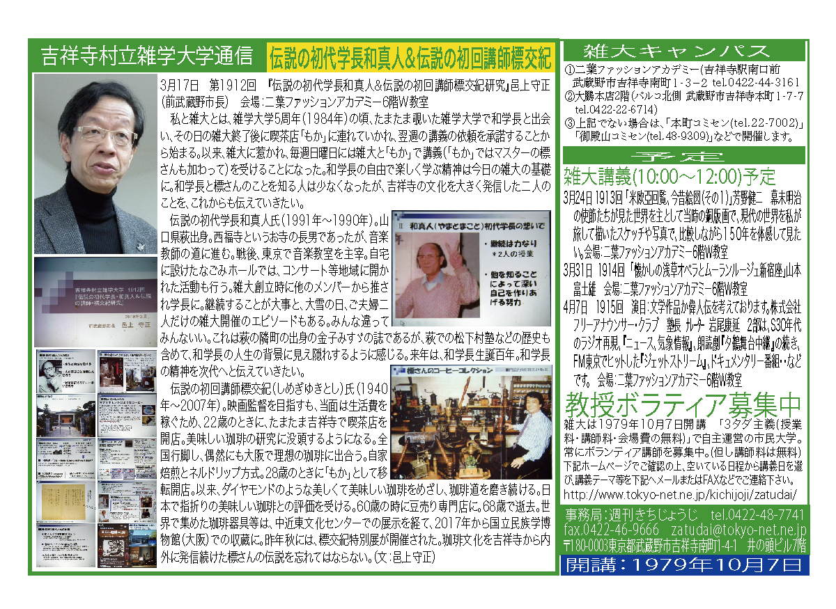 | 3月17日 1912回 | 「伝説の初代学長・和真人&伝説の講師・標交紀研究」邑上守正前武蔵野市長 会場:二葉ファッションアカデミー6階W教室 |