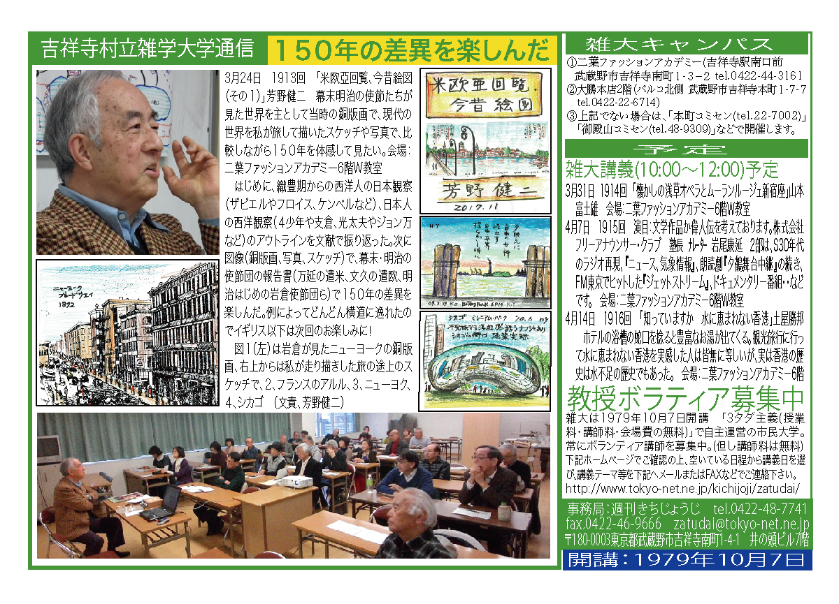 | 3月24日 1913回 | 「米欧亞回覧、今昔絵図(その1)」芳野健二 幕末明治の使節たちが見た世界を主として当時の銅版画で、現代の世界を私が旅して描いたスケッチや写真で、比較しながら150年を体感して見たい。会場:二葉ファッションアカデミー6階W教室 | |