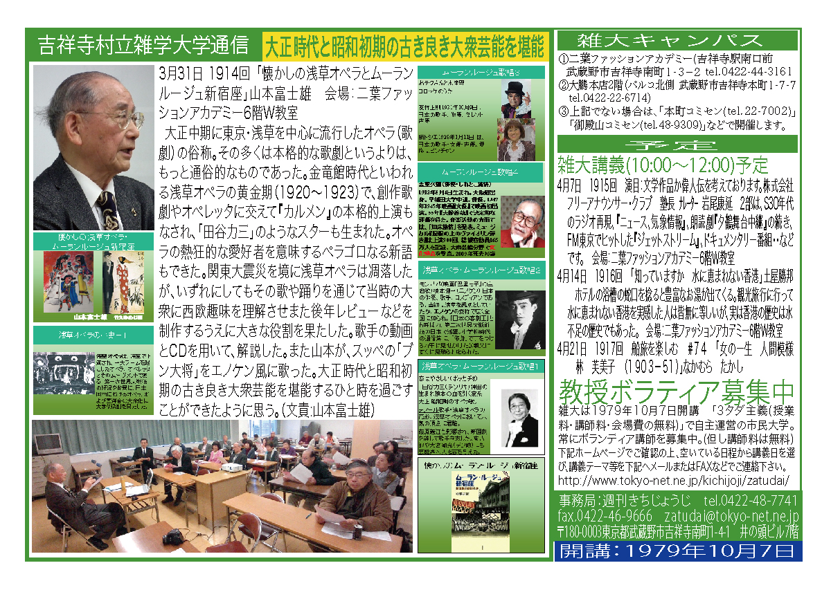 | 3月31日 1914回 | 「懐かしの浅草オペラとムーランルージュ新宿座」山本富士雄 会場:二葉ファッションアカデミー6階W教室 |