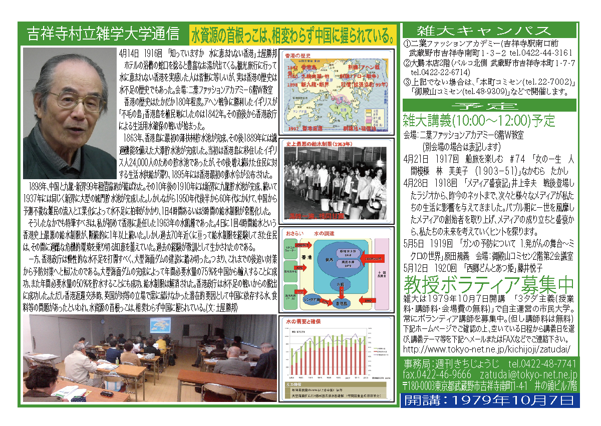 | 4月14日 1916回 | 「知っていますか 水に恵まれない香港」土屋勝邦 ホテルの浴槽の蛇口を捻ると豊富なお湯が出てくる。観光旅行に行って水に恵まれない香港を実感した人は皆無に等しいが、実は香港の歴史は水不足の歴史でもあった。 | |