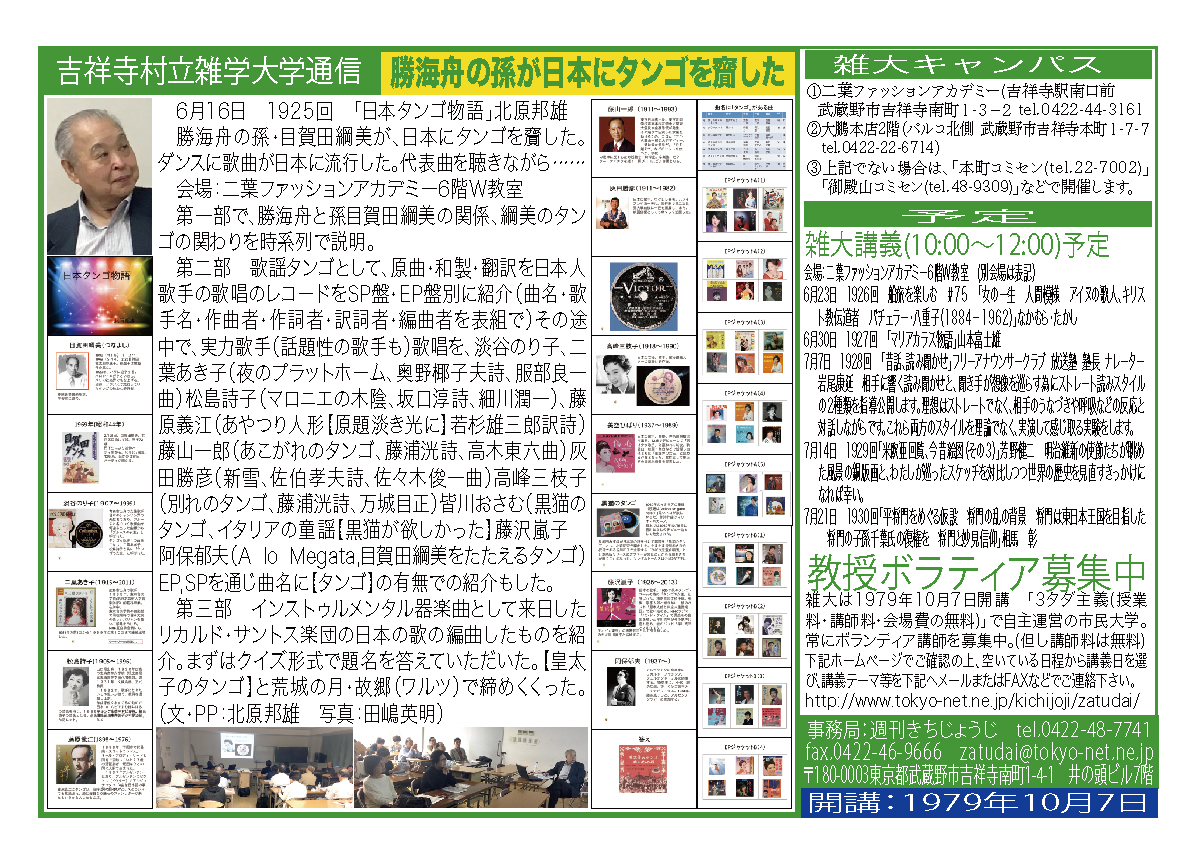 | 6月16日 1925回 | 「日本タンゴ物語」北原邦雄 勝海舟の孫が日本にタンゴを齎した。ダンスに歌曲が日本に流行した。代表曲を聴きながら…… |