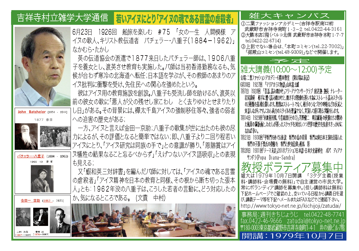 | 6月23日 1926回 | 船旅を楽しむ #75 「女の一生 人間模様 アイヌの歌人、キリスト教伝道者 バチェラー・八重子(1884−1962)」なかむら・たかし |