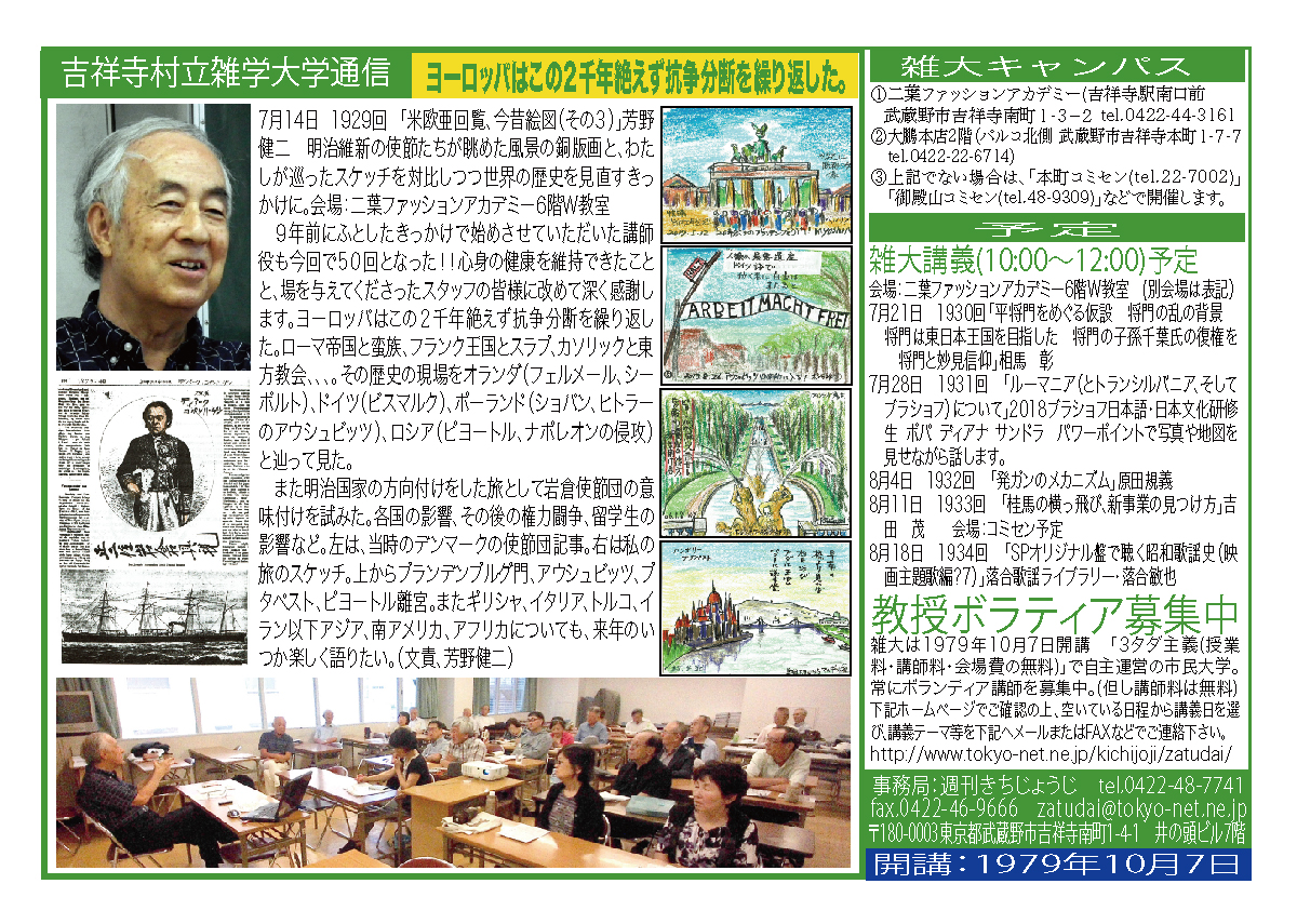 | 7月14日 1929回 | 「米欧亜回覧、今昔絵図(その3)」芳野健二 明治維新の使節たちが眺めた風景の銅版画と、わたしが巡ったスケッチを対比しつつ世界の歴史を見直すきっかけになれば幸い。 | |