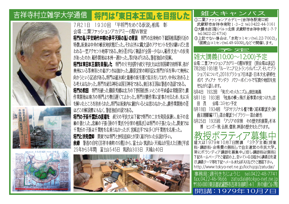 | 7月21日 1930回 | 「平将門をめぐる仮設 将門の乱の背景 将門は東日本王国を目指した 将門の子孫千葉氏の復権を 将門と妙見信仰」相馬 彰 |
