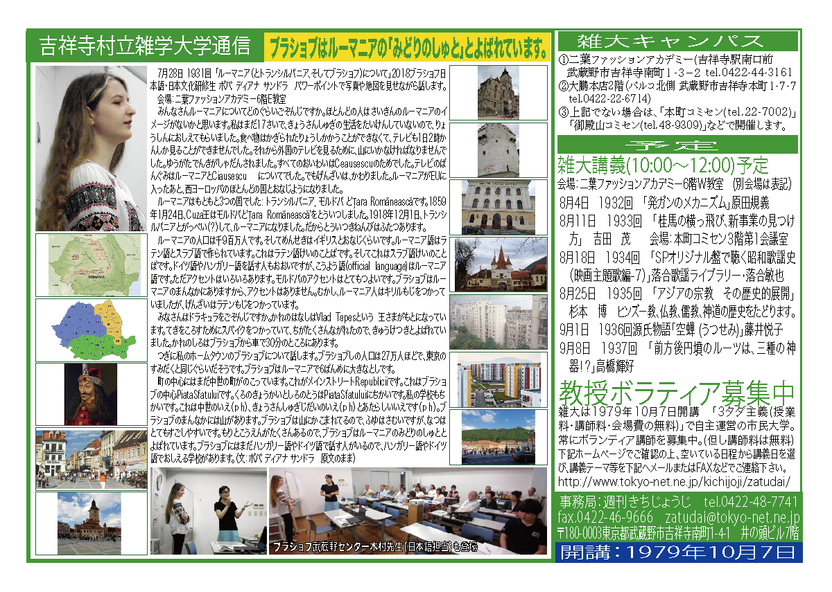 | 7月28日 1931回 | 「ルーマニア(とトランシルバニア、そしてブラショフ)について」2018ブラショフ日本語・日本文化研修生 ポパ ディアナ サンドラ(Popa Diana−Sandra) パワーポイントで写真や地図を見せながら話します。 |