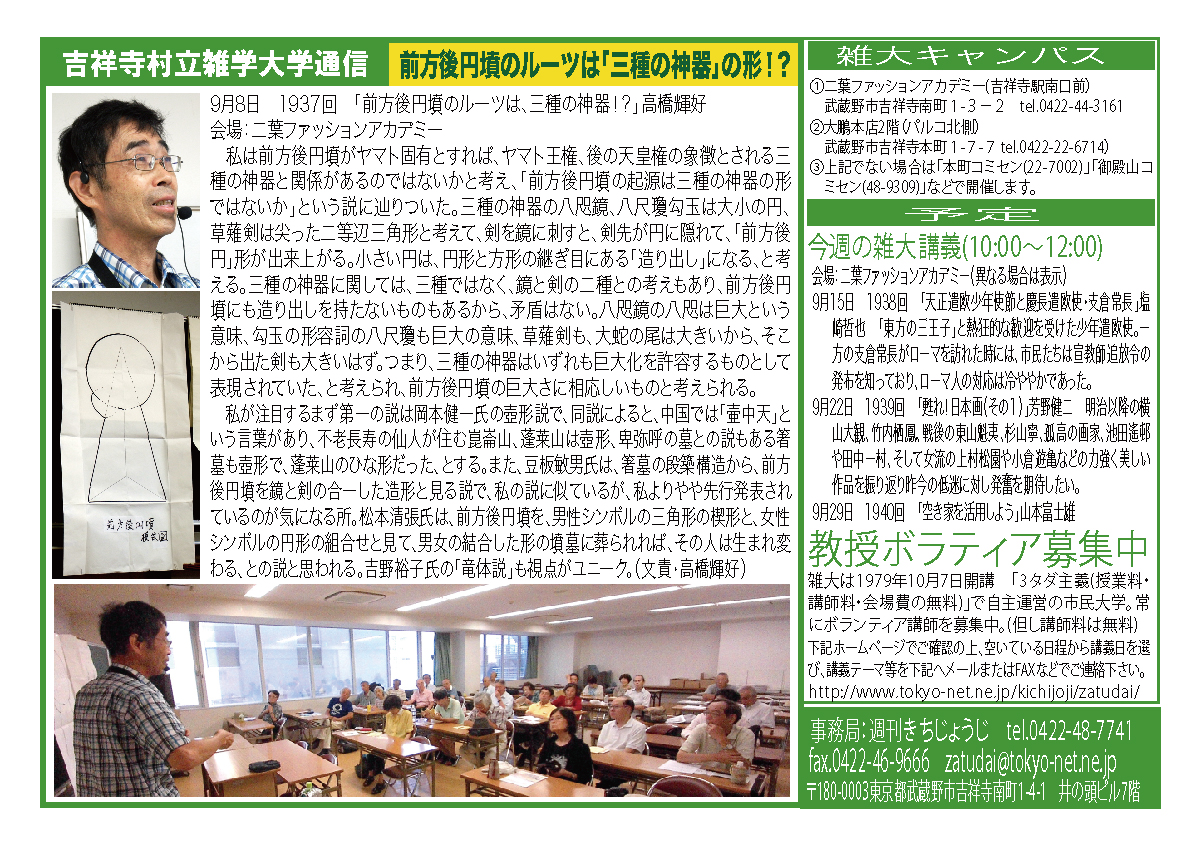 | 9月8日 1937回 | 「前方後円墳のルーツは、三種の神器!?」高橋輝好 | |