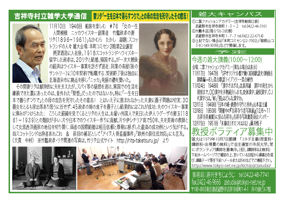 | 11月10日 1946回 | 船旅を楽しむ #76 「女の一生 人間模様 ニッカウイスキー創業者 竹鶴政孝の妻 リタ(1896−1961)」なかむら たかし 副題;スコットランドの人々 |