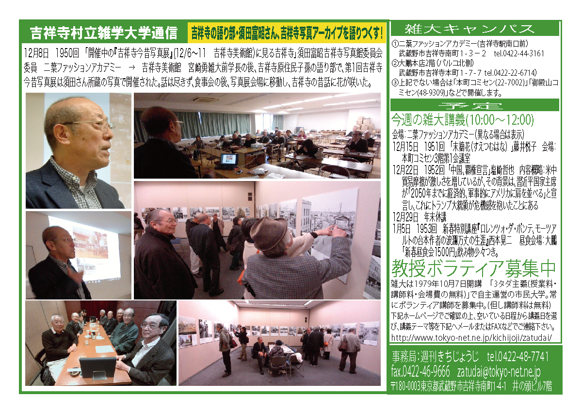 | 12月8日 1950回 | 「開催中の『吉祥寺今昔写真展』(12/6〜11 吉祥寺美術館)に見る吉祥寺」吉祥寺写真館委員会メンバー | |