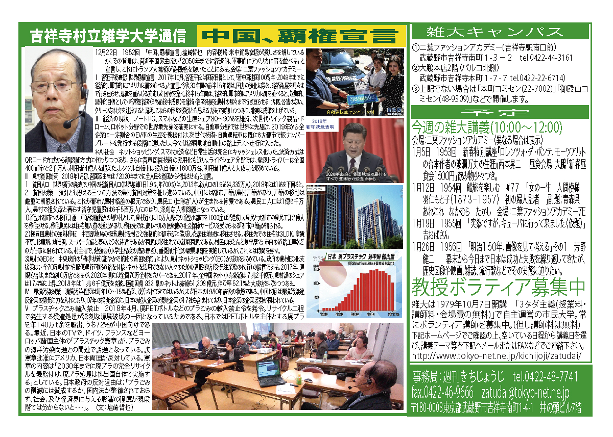 | 12月22日 1952回 | 「中国、覇権宣言」塩崎哲也 内容概略:米中貿易摩擦が激しさを増しているが、その背景は、習近平国家主席が「2050年までに経済的、軍事的にアメリカに肩を並べる」と宣言し、これにトランプ大統領が危機感を抱いたことにある |